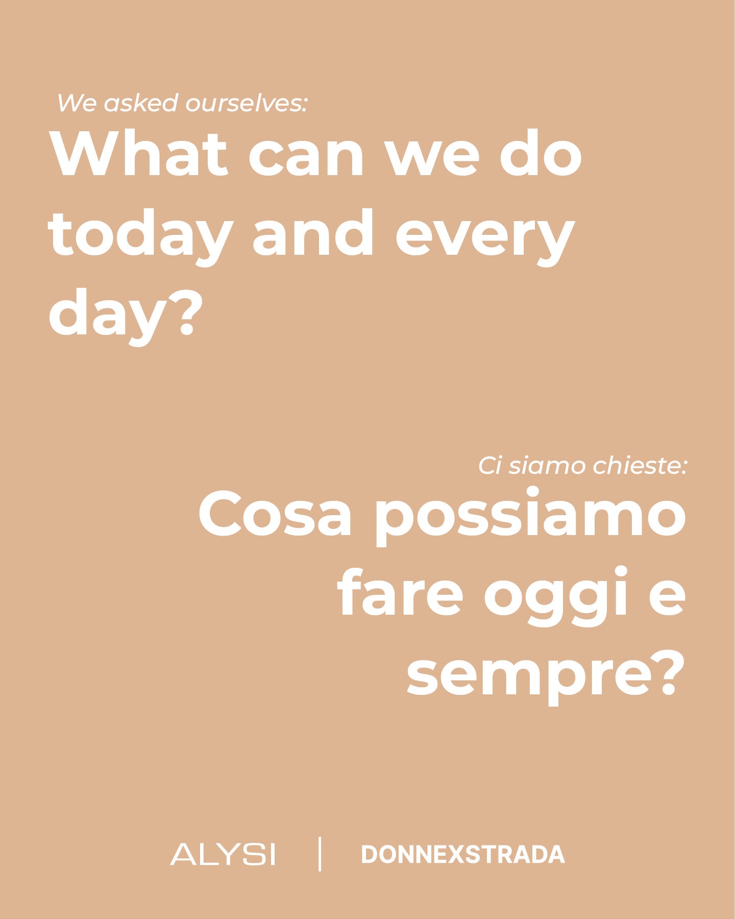 Così come un legame di amicizia tra donne, lo stesso è per DONNEXSTRADA e ALYSI, una liason, prima ancora che una partnership, tra due realtà che guardano al cambiamento con ottimismo, mettendolo in atto ogni giorno, non solo nelle ricorrenze prestabilite.